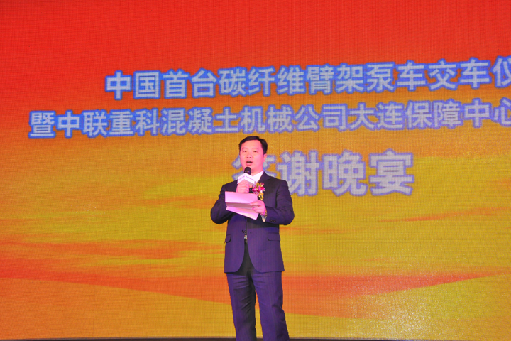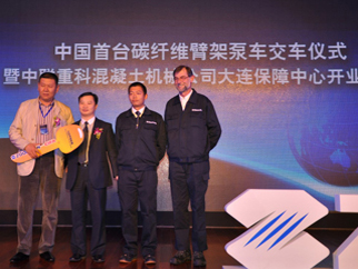 11�?8日,大连经济技术开发区永兴建材有限公司董事长孙永革从中联重科混凝土公司东北大区经理吴飞红中接过了中国第一台碳纤维62米长臂架泵车的金钥匙。这标志着碳纤维长臂架泵车首次落户中国市场,中国泵车应用史至此掀开了崭新的篇章�?br /> 中国混凝土泵车用户再次享受到中联重科技术产品创新的盛果,享受到碳纤维臂架泵车为用户带来的全新价值体验和增值服务。来自大连市混凝土行业协会会长陈刚与混凝土机械用户共同鉴证了这个历史时刻。碳纤维臂架泵车是中联重科融合欧洲技术所拥有的全球专利——碳纤维臂架技术和引进意大利CIFA世界领先的全套工艺流程的结晶�?