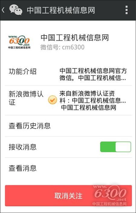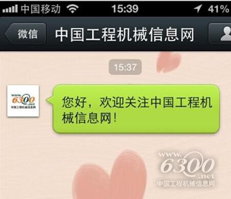 6.关注“中国工程机械信息网”并接收到信息网发送的信息,恭喜你关注成功!如下图: