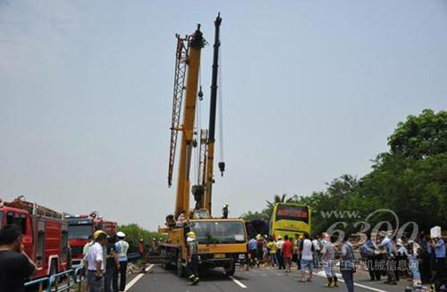 6月14日上午九时许,海南东线高速公路海口往三亚方向59公里处发生一起重大车祸,一辆载满木条的大货车侧翻埋压住一辆小轿车后,又撞上大巴车,事故导致小轿车上的4人当场死亡,2人受伤。车祸发生后,附近施工的2台徐工牌起重机迅速赶往车祸现场,协助救援,体现出徐工“担大任”的社会责任感。