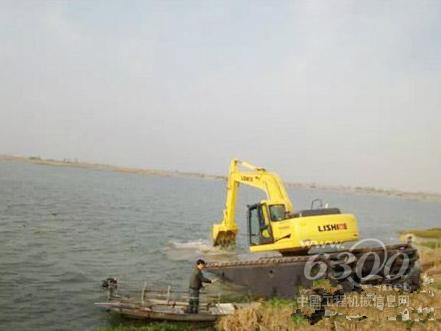 力士德湿地液压挖掘机下水前须用挖掘机铲斗试探水下深度和平整度;试探后机器应缓慢驶入水中,切忌加速蹿行,避免因平衡不稳造成倾翻。到达清淤藕田需穿过高邮湖,挖机借助铲斗支撑,由高邮湖湖堤的渔船牵引行走。力士德两栖挖掘机依靠浮箱的浮力,在藕田清淤中大显身手,工厂服务人员全程跟踪服务,取得当地政府、渔民和购机老板的一致认可和赞许。