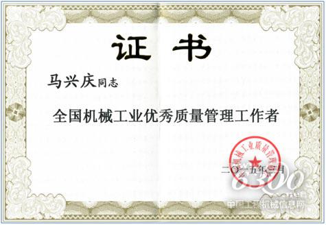 山东临工马兴庆获"全国工业优秀质量管理工作者"称号