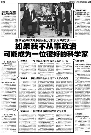 温家宝:我非常高兴接受这次采访。我想先说两句话:一是如果我不从事政治的话,我也可能成为一位很好的科学家。二是在我从政这几十年当中,一直没有离开过对科学技术的关注。我认为一位好的领导者,是应该具备科学素养和科学知识的。我今天把您作为朋友,倾心交谈,我们彼此之间都不必拘束,您可以问我问题,我们也可以讨论问题。