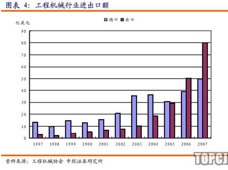 近年来,我国工程机械取得了令人瞩目的成就,逐步完成了进口替代,这首先得益于我国宏观经济的发展、大量基础设施和房地产业的快速发展以及政府的支持。国内对工程机械强势拉动,使得我国工程机械企业能够获得发展的时间、空间和资金,在发展中逐步提高我国企业的技术实力和质量水平,同时也归功于我国企业创新和追求精神,能够在发展同时,逐步提高我国企业的技术实力和质量水平。近几年我们工程机械业在大规模进行进口替代的同时,也在世界工程机械市场上崭露头角,出口增长很快,已经成为拉动全行业快速增长的火车头。