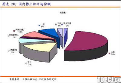 山推股份山推股份是国内最大的推土机生产商,公司07年生产推土机3600台,国内市场占有率达到了51%,其中出口1418台,占总产量的38%,1季度达到50%,预计出口在推土机销售中所占比重今后还将继续上升,小松山推的挖掘机提供了公司稳定的利润增长我国挖掘机产品长期处于落后地位。小松山推在国内具有较为领先的技术优势,未来几年小松山推仍然能够给公司带来持续而稳定的利润增长。同时公司还将充分利用与小松合作过程中积累的技术和经验,发展10吨以下的小型挖掘机,预计08年试产500台左右,09年有望进入规模化经营。