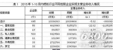 据国家统计局2015年10月全国内燃机行业645家规模以上企业主要经济指标快报显示,2015年1-10月除亏损额、资产总计、存货及产成品增长外,其余主要财务指标均有不同程度下降。具体情况如下: