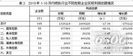 从全国内燃机行业规模以上企业不同控股企业实现利润看,2015年1-10月,私人控股企业利润总额高于上年同期,同比增长4.40%;国有控股企业、集体控股企业、港澳台商控股企业、外商控股企业、其他控股企业利润总额低于上年同期,同比分别下降40.91%、6.45%、39.50%、5.80%、10.82%(具体见表2)。