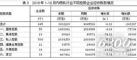 应收账款占用资金小幅下降。截止2015年10月末,全国内燃机行业规模以上企业应收账款为380.22亿元,同比下降6.02%、同比降低资金占用24.34亿元。(具体见表3)