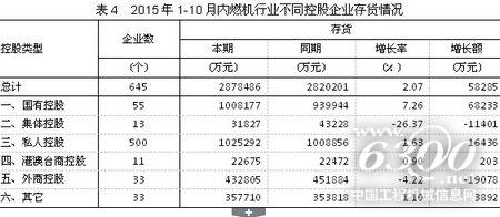 库存占用资金小幅增长。2015年10月末,全国内燃机行业规模以上企业存货资金为287.85亿元,同比增长2.07%,同比增加资占用5.83亿元。(具体见表4)