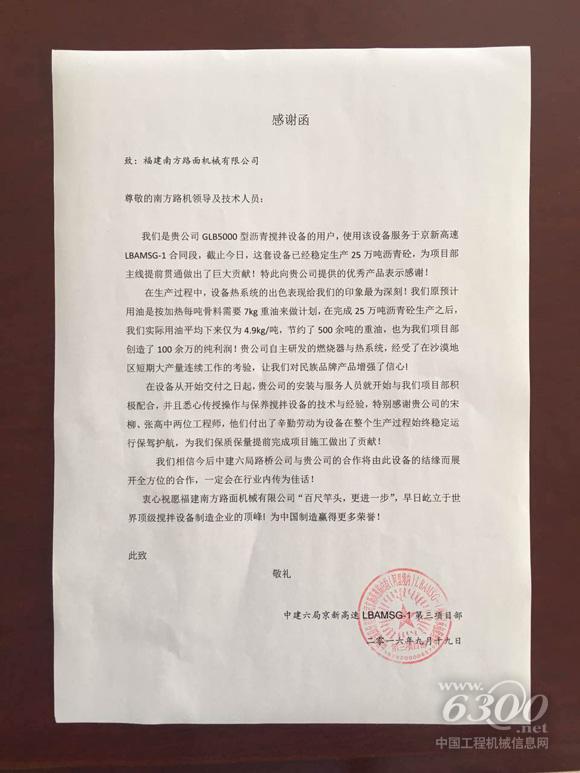 金秋好时节,我们收到了一封客户来信。在信中,客户对南方路机GLB5000型沥青搅拌设备及服务给予了肯定。“平均耗油4.9kg/吨”、“沙漠地区短期大量连续生产”、“技术指导与服务”,这些都是我们应该做到、做好的;“百尺竿头,更进一步”是客户对我们的真诚期望,我们会一如既往做专做精、做好做久。