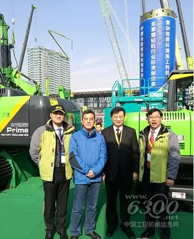 中国工程机械工业协会常务副会长兼秘书长苏子孟(右二)、桩工机械分会秘书长黄志明(左二)亲临泰信机械展位