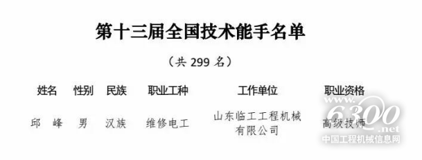 11月30日,人力资源和社会保障部发布《人力资源和社会保障部关于表彰第十三届中华技能大奖和全国技术能手的决定》(人社部函〔2016〕285号),山东临工首席技师邱峰被授予“全国技术能手”荣誉称号。