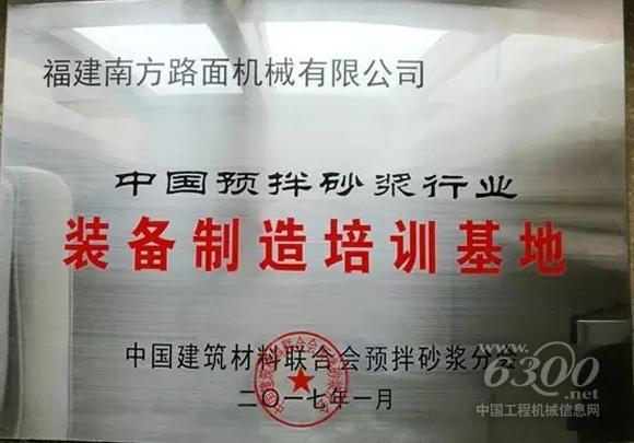 2017年1月10日,在2017'首届中国国际预拌砂浆装备技术研讨会暨预拌砂浆绿色生产装备及机械化施工技术峰会上,福建南方路面机械有限公司被中国建材联合会预拌砂浆分会授予“中国预拌砂浆行业装备制造培训基地”;同时,因在国家标准GB51176-2016《干混砂浆生产线设计规范》编制工作中的特殊贡献,被授予“特别贡献单位”。