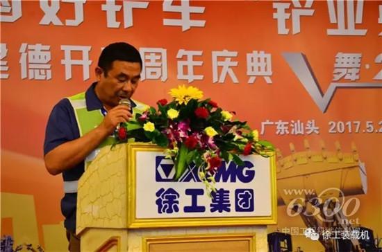 贤群采石场总经理陈英群作为客户代表发言,陈总坦言与徐工装载机的合作是一次互信互利,不断提升自身价值的双赢之路,也祝愿徐工装载机更加辉煌.