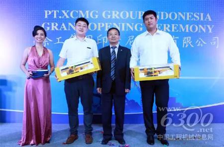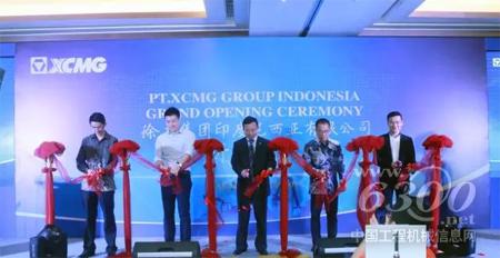 开业仪式上,中国驻印尼大使馆经商参处一等秘书胡啸山先生、徐工集团进出口有限公司副总经理扈向阳先生、印度尼西亚代理商GMT公司董事长李锦财先生、印尼德龙朱明冬先生、印尼万向镍业冯祥宝先生一同为徐工印尼公司开业剪彩。