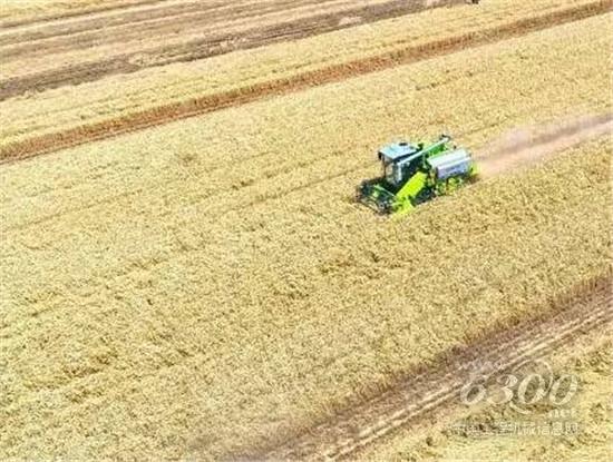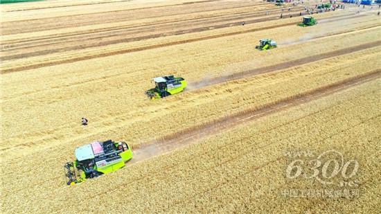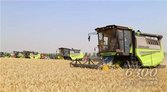 5月28日上午,在河南唐河县大片麦田里,中联重科农业机械组合上阵,场面十分壮观。