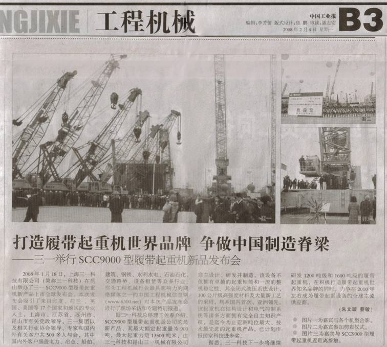 2008年1月18日,上海三一科技有限公司在昆山举办了三一SCC90000型履带起重机新产品上市全球发布会。本次发布会吸引了来自包括印度、荷兰 、英国 、美国等的17个国家和地区的专业人士,上海市、江苏省、苏州市、昆山市有关党政领导,三一集团以及相关行业协会领导、专家和国内外有关客户共500多人参加了本次盛会,其中国内外客户涵盖电力、冶金、船舶、建筑、钢铁、水利水电,石油石化、交通路桥、设备租赁等众多行业。作为工程机械行业最具影响力的网络媒体,中国工程机械信息网( ycsqzl88.com)对本次产品发布会进行了现场采访和专题特别报道。