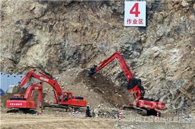 ▲厦工智能挖掘机在永泰滑坡灾害现场进行排险作业