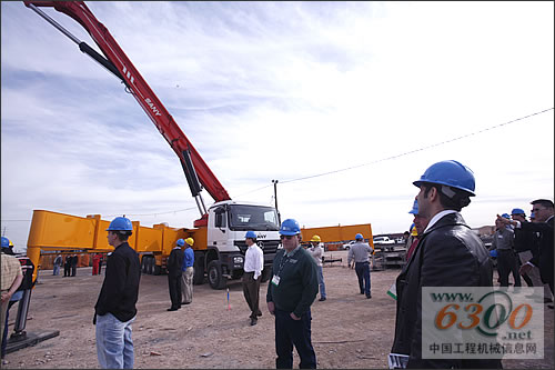 一些美国客商在66米泵车前驻足观赏泵送演示