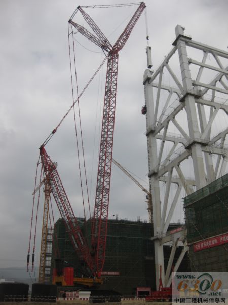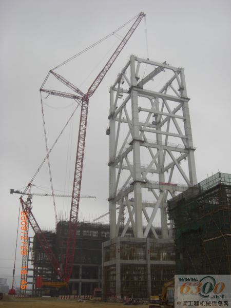 2009年2月12日,SCC9000履带起重机以96m主臂+60 m副臂带超起工况,作业半径38m,吊装设备:1000MW火力发电厂锅炉立柱,设备重52t。
