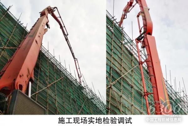 调研队来到诸暨的施工现场,对L8系列58米泵车进行臂架减震功能效果验证。针对客户反映的泵送慢、臂架振幅大两个问题,工程师现场制定解决方案,经过一系列排查后,找到原因所在,最终重新设置了油泵电流,使臂架振幅大幅降低。