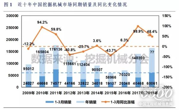 根据中国工程机械工业协会挖掘机械分会统计数据,2018年1-3月纳入分会统计的25家主机制造企业共销售各类挖掘机械产品60061台(含出口),较去年同期上升48.4%,销售产品平均吨位16.3吨,较去年同期上升11.2%。其中2018年3月销量38261台,同比上涨78.9%,销售产品平均吨位15.7吨,较去年同期上升5.8%。
