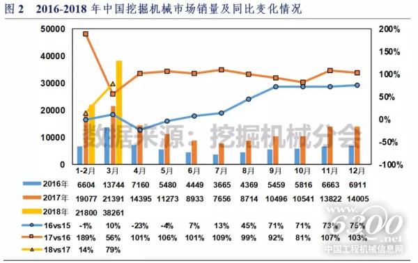 中国挖掘机械市场自2016年下半年进入高速增长通道,9月至12月连续四个月涨幅超过70%,2017年增长势头更加强劲,全年销量接近翻番增长。进入2018年以来,在高基数基础上,行业保持稳健增长态势。