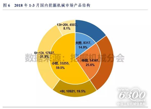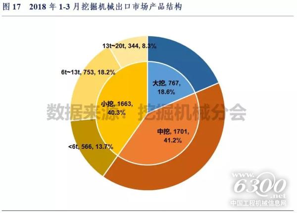 2018年1-3月大挖、中挖、小挖销量分别为767、1701和1663台,市场份额分别为18.6%、41.2%和40.3%。其中6吨以下迷你挖销量和6~13吨小挖销量分别为566和753台,市场份额分别为13.7%和18.2%。