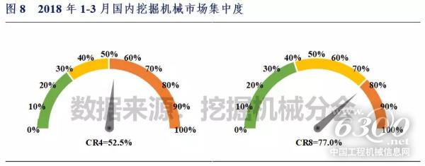 2018年1-3月国内挖掘机械市场集中度CR4=52.5,CR8=77.0,相比2月市场集中度有所上升(前值CR4=51.2,CR8=76.0)。其中,大挖、中挖、小挖CR4市场集中度分别为59.8%、51.3%和52.2%,CR8市场集中度分别为83.0%、78.0%和76.8%。