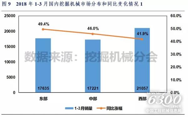 2018年1-3月东部、中部、西部地区挖掘机械销量分别17635、17221和21057台,同比涨幅分别49.4%、46.0%和41.9%。
