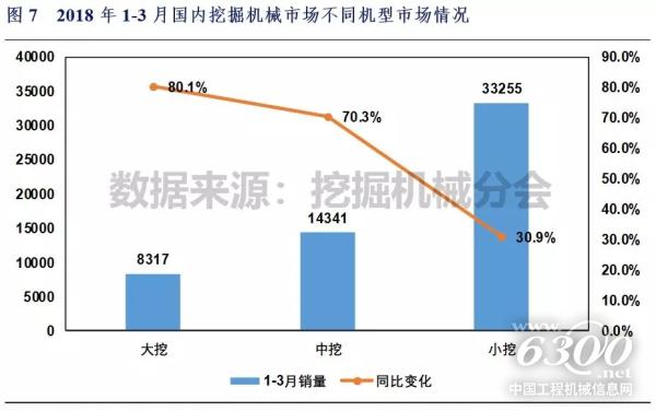 2018年1-3月国内大挖、中挖、小挖销量分别为8317、14341和33255台,市场份额分别为14.9%、25.6%和59.5%。小于6吨的微挖和6~13吨范围的小挖占据国内约一半的市场份额。从不同规格产品销量变化看,大挖、中挖和小挖销量同比增加3700、5919和7852台,涨幅分别80.1%、70.3%和30.9%。
