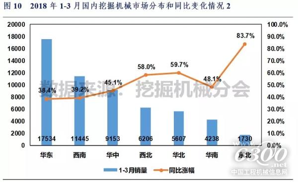 2018年1-3月华东、西南、华中、西北、华北、华南和东北地区挖掘机械销量分别17534、11445、9153、6206、5607、4238和1730台,同比涨幅分别38.4%、39.2%、45.1%、58.0%、59.7%、48.1%和83.7%。