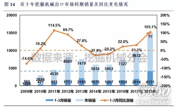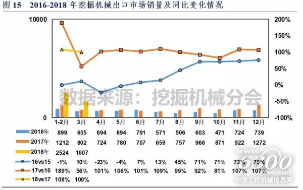 根据中国工程机械工业协会挖掘机械分会统计数据,2018年1-3月纳入分会统计的25家主机制造企业共实现出口各类挖掘机械产品4131台,较去年同期上升105.1%,销售产品平均吨位20.1吨,较去年同期上升8.1%。其中2017年3月份销量1607台,同比上涨100.4%,销售产品平均吨位21.3吨,较去年同期上升10.9%。