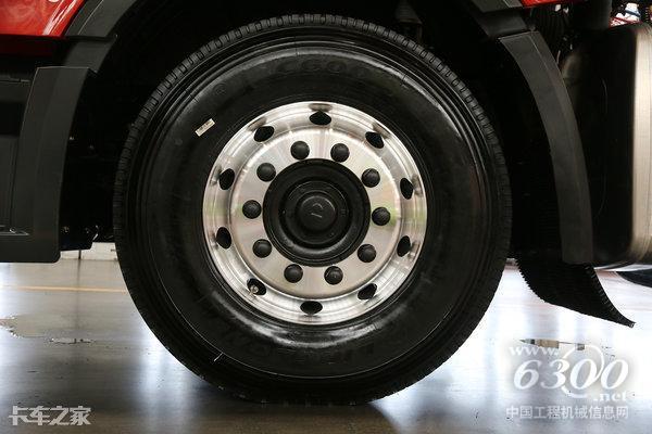 前桥加装了横向稳定杆,可以给车辆高速行驶提供更好的抗侧倾能力。前轮车轮采用铝合金材质,后轮则配置为材质为钢的车轮,在保证车辆自重的同时,也能够进一步降低车辆的成本。轮胎型号为1200R22.5,品牌为玲珑,并且前后翼子板内均配备了防飞溅装置。