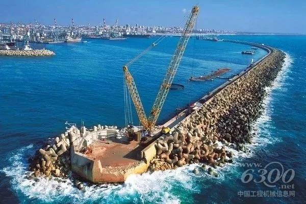 在以色列阿什杜德港,9台徐工履带式起重机在风浪中吊装稳定,表现可靠,不仅出色的完成了防波堤的构筑,更是在港口构筑起了一条金色的风景线。