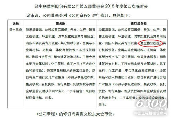 当晚,中联重科还披露了董事会对《公司章程》的修改内容。公司表示,因业务发展的需要,公司拟在经营范围中增加“高空作业机械”。此举表明中联重科正在加快部署新业务。