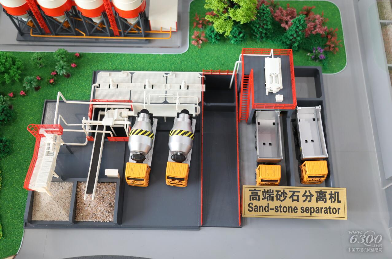 微缩模型的最西面为山地,设置高铁专用工程站,山体贯穿铁路隧道,附近有高铁站;中间为平原,设置标准环保站,占地面积小便于施工,符合中部发展形势;再往东为高端环保站和砂石分离机,高端环保站具有环保、节能特性,适宜东部经济较发展状况,既体现环保又符合中国发展状态。