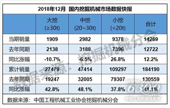 这是一份令人肾上腺飙升的数据:根据中国工程机械工业协会挖掘机械分会行业统计,2018年1—12月纳入统计的25家主机制造企业,共计销售各类挖掘机械产品203420台,同比涨幅45.0%。国内市场销量(统计范畴不含港澳台)184190台,同比涨幅41.1%。出口销量19100台,同比涨幅97.5%。