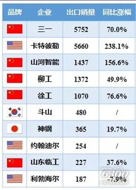 出口数据:2018年纳入统计的25家主机制造企业共计出口销量为19100台,同比涨幅97.5%,占总销量的9.39%。根据2018年1—11月的挖机出口数据,三一、卡特、山河智能分别占据出口销量的前三位。
