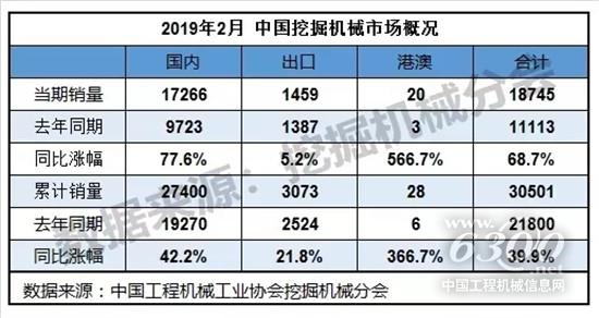 挖掘机1-2月销量合计30501台,同比涨幅39.9%。国内市场销量(统计范畴不含港澳台)27400台,同比涨幅42.2%。如此可观的市场销量,有的机友甚至表示:2019年前两个月的挖机销量相当于2013年全年的一半!