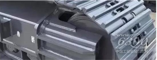 履带主要由履带板和链轨节组成,履带板分为标准板和加长板。标准板用于土方工况,加长板用于湿地工况。矿山上对履带板的磨损最严重,行走时碎石有时会卡在两块板之间的缝隙中,当转至与地面接触时就会对两块板产生挤压,履带板就容易发生弯曲变形,长时间行走也会使履带板螺栓固定处出现开裂问题。链轨节是与驱动齿圈接触由齿圈带动进行旋转。履带涨紧度过紧会造成链轨节、齿圈和引导轮早期磨损。所以应根据施工路况不同,调节履带张紧度。