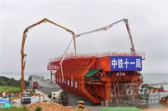 6月13日15时30分,随着最后一泵混凝土的注入,福厦高铁湄洲湾跨海大桥首孔移动模架现浇梁顺利浇筑完成,标志着国内时速350公里首片40米大跨度移动模架现浇梁施工取得关键性突破,此项成套技术在世界尚无先例。