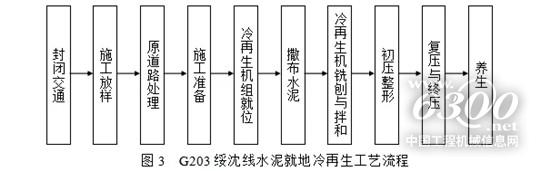 此技术可用于各等级公路沥青路面的大修和改扩建工程,水泥就地冷再生层可用作道路的底基层或基层。此次青冈至安达路段的水泥就地冷再生层作为底基层使用,水泥添加量为4.5%,采用水泥撒布车撒布水泥。再生施工使用WR 250,再生施工过程遵循图3所示流程。