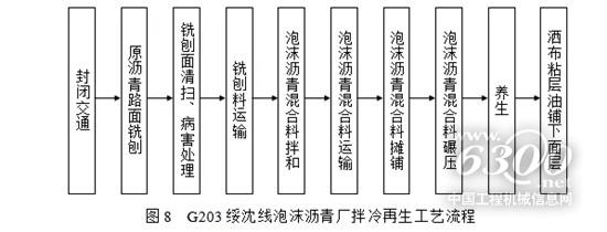 此次望奎路段的泡沫沥青厂拌冷再生层作为下面层使用,水泥添加量为1.8%,泡沫沥青用量为3.0%,发泡水用量为2.0%,外加水用量为1.2%。厂拌施工中采用了KMA 220再生设备,再生过程遵循图8所示流程。