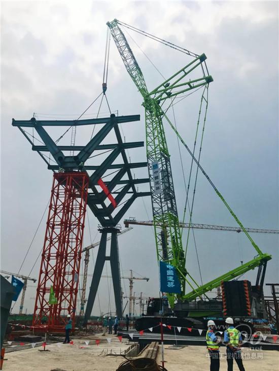 施工现场,中联重科ZCC3000履带吊正在吊装屋架钢构