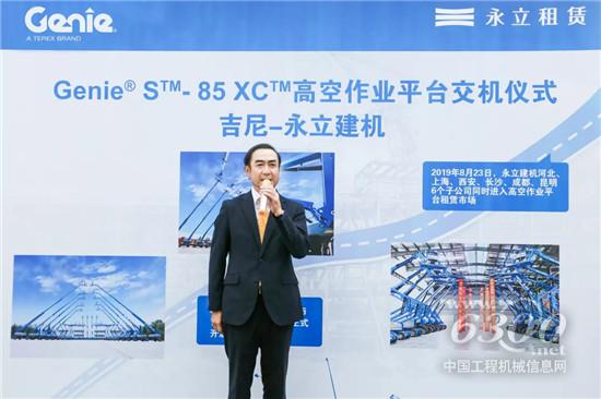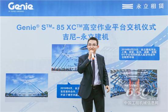 永立建机总经理助理蒋晓宇先生在仪式上发言:“永立建机(中国)有限公司为原装日立挖掘机及矿用自卸卡车的中国总代理,在工程机械销售领域已有20多年的历史。2019年随着公司发展的需要,决定增加设备租赁项目,先期以高空作业平台进入市场,今后计划增加挖掘机等其它租赁设备,成为综合性的设备租赁公司. 吉尼是国际知名的高空作业车品牌,可靠的产品质量、及时快速的服务解决方案以及共同的价值观,成就了双方的合作。此次永立建机在经过慎重的比较选择后,一次性订购了吉尼500台臂车。随着业务的拓展,网点的增建,我们今后将持续增加吉尼设备的投入。“