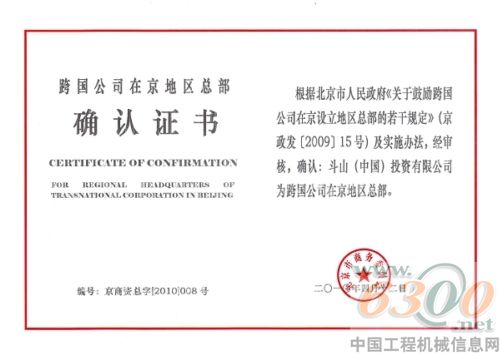 2010年4月21日,斗山(中国)投资有限公司(DICI)喜获北京市商务委员会批准的“跨国公司在京地区总部确认证书”。DICI在2010年3月26日向北京市商委提交地区总部申请,4月获得正式批准。这是中国政府对斗山在中国经济社会发展中作出积极贡献的肯定,同时也表明了北京对于斗山作为优秀的跨国企业的认可,这将对斗山在中国的发展有着里程碑式的作用。