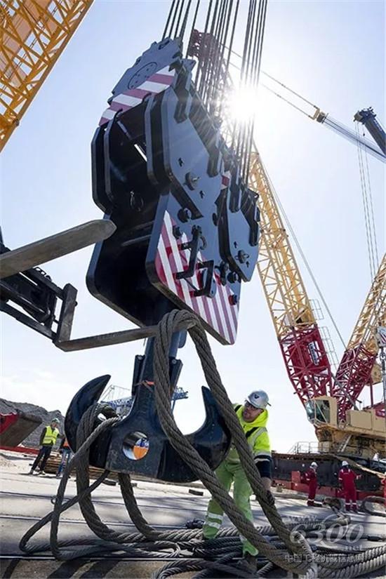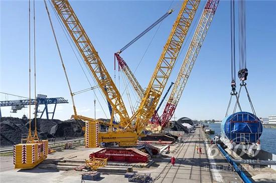 这次,利勃海尔LR 11350和LR 11000合体安装一台隧道钻机,这据悉,是莱茵河港口科尔历史上最重的装载量——使用了1600吨压载配重。