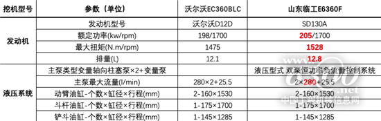 发动机对比对比沃尔沃EC360BLC(左)、山东临工E6360F挖掘机(右)