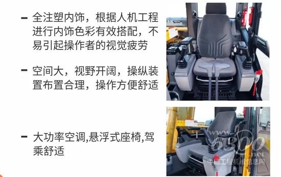 注塑内饰,根据人机工程进行内饰色彩有效搭配,不易引起操作者的视觉疲劳空间大,视野开阔,操纵装置布置合理,操作方便。舒适大功率空调,悬浮式座椅,驾乘舒适。