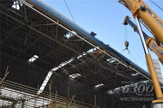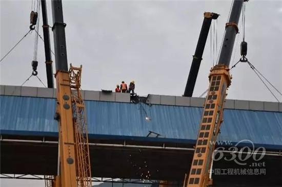 一侧切割,分块吊装,根据两侧重量和压力的悬殊,郑国胜团队按照前期设计好的吊装方案,300吨负责整体稳定,一台70和一台40则负责仍在同行一侧的稳定、两台80吨用来稳住切割线以内的网架、两台110吨则负责吊装已切割完成的网架,并将其平放路面,25吨则负责将拆解的网架装车迅速运离现场。